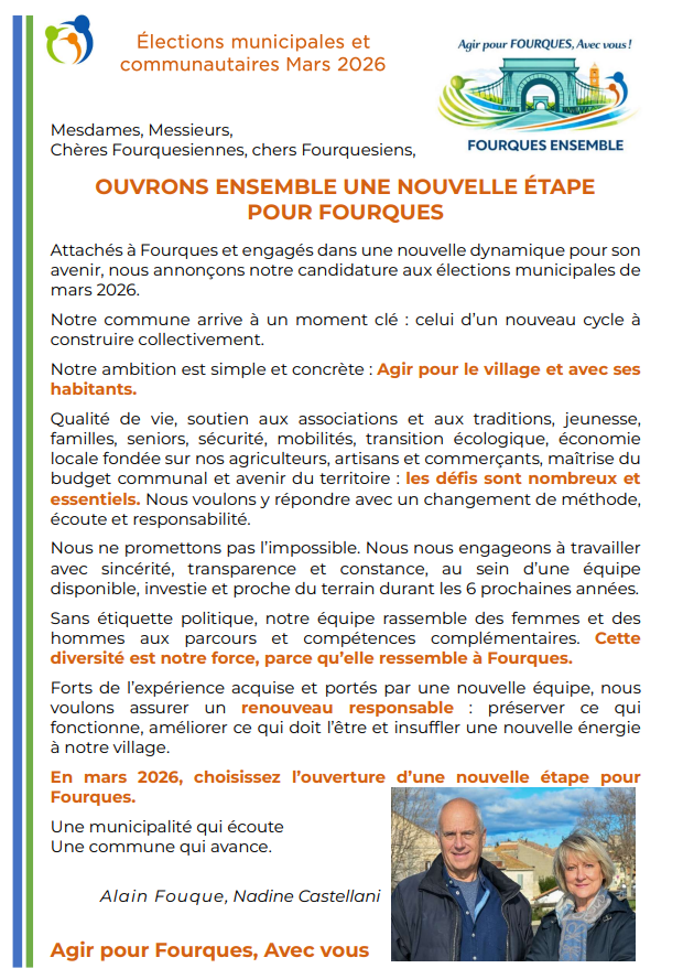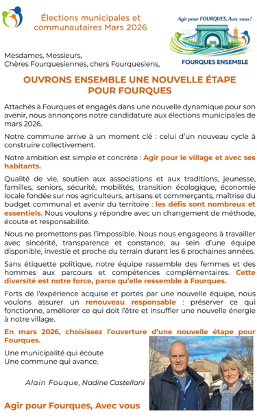 Site de campagne- Elections municipales de Fourques 30. Conformément au code électoral, ce site constitue un support de propagande électorale. Dépenses prises en charge par le candidat.