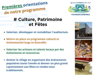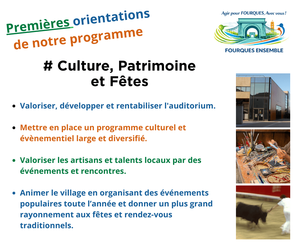 Notre projet se construit avec les Fourquesiens Dans quelques jours, dans vos boites aux lettres les orientations de notre programme municipal. D’ici là, nous vous dévoilons les premières propositions. #sequence5 CULTURE, PATRIMOINE ET FETES 📌 Le programme détaillé suivra très prochainement.