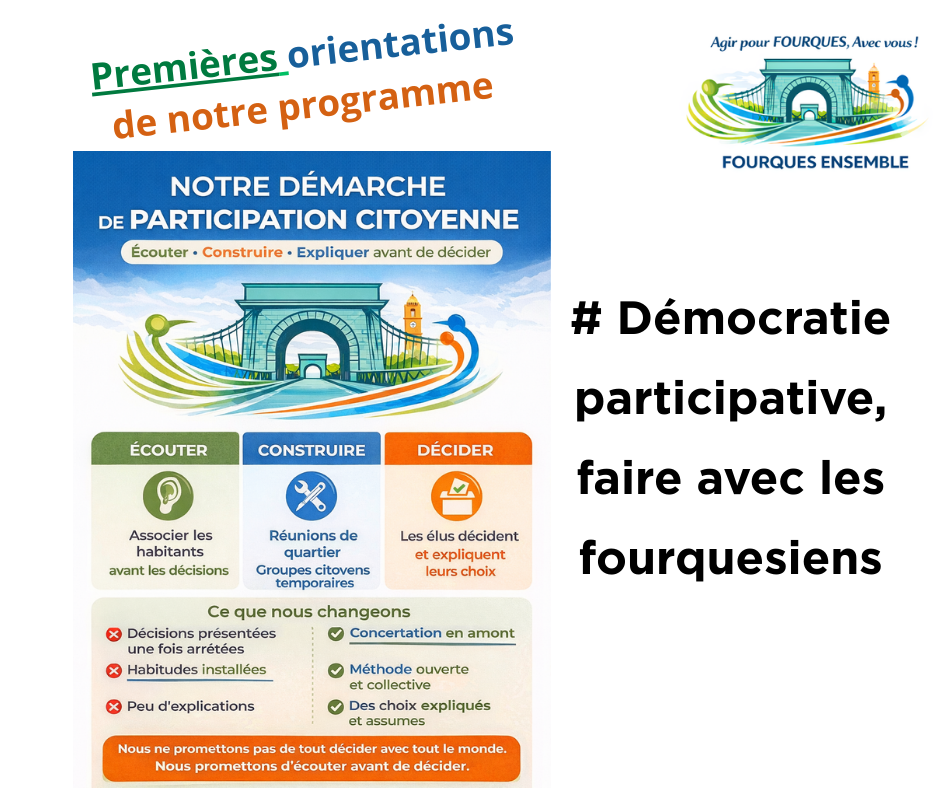 Notre projet se construit avec les Fourquesiens Dans quelques jours, dans vos boites aux lettres les orientations de notre programme municipal. D’ici là, nous vous dévoilons les premières propositions. #sequence7 DEMOCRATIE PARTICIPATIVE, FAIRE AVEC LES FOURQUESIENS. 📌 Le programme détaillé suivra très prochainement.