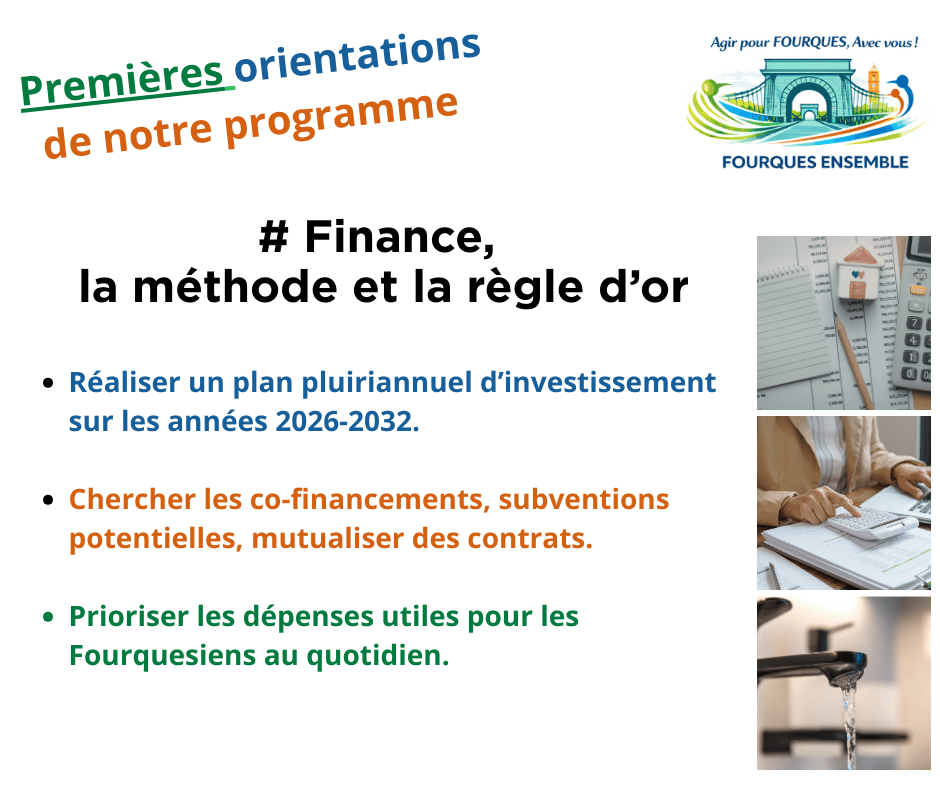Notre projet se construit avec les Fourquesiens Dans quelques jours, dans vos boites aux lettres les orientations de notre programme municipal. D’ici là, nous vous dévoilons les premières propositions. #sequence8 FINANCES, LA REGLE D'OR. 📌 Le programme détaillé suivra très prochainement.